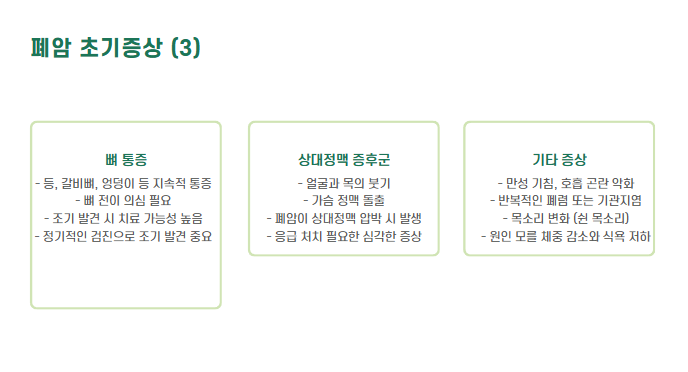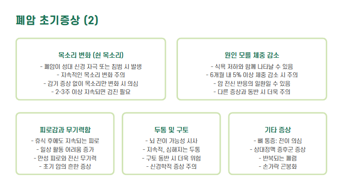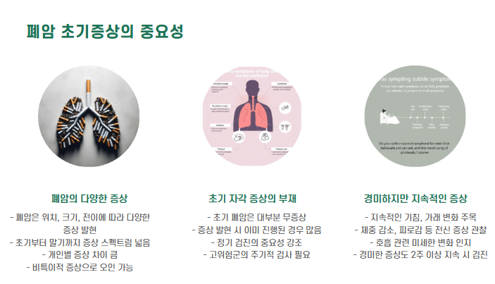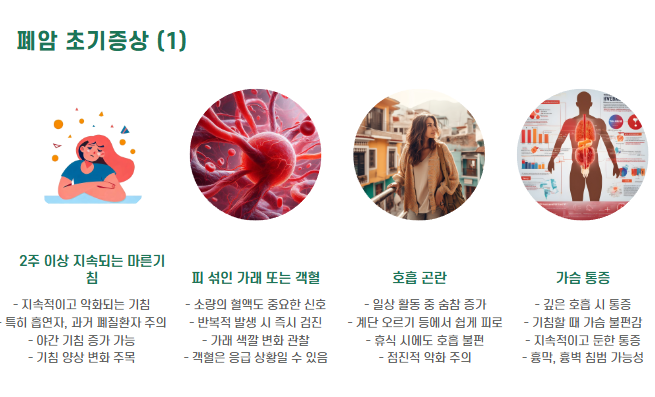 폐암은 초기 증상이 없거나 경미하여 조기 발견이 어렵지만, 위에서 언급한 증상들이 지속되거나 악화된다면 즉시 전문의의 진료를 받는 것이 중요합니다. 정기적인 건강검진과 금연, 대기오염 노출 최소화 등을 통해 폐암을 예방하고, 건강한 삶을 유지하시기 바랍니다.