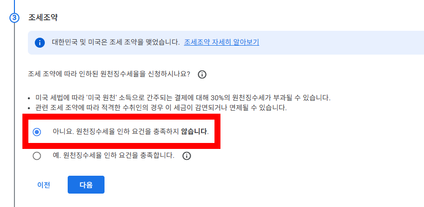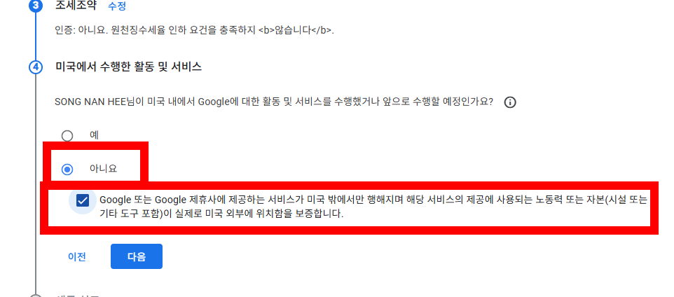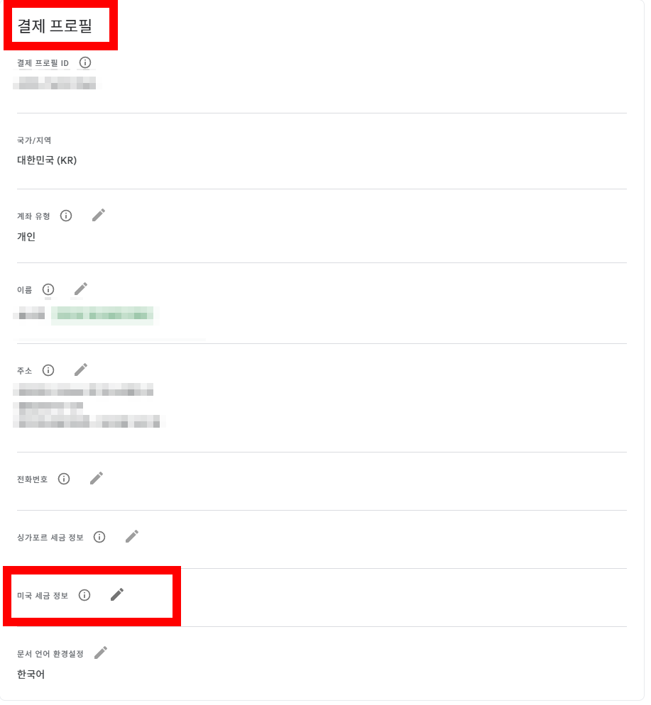- 결제 프로필 -> 미국 세금 정보 (연필 모양) 클릭
