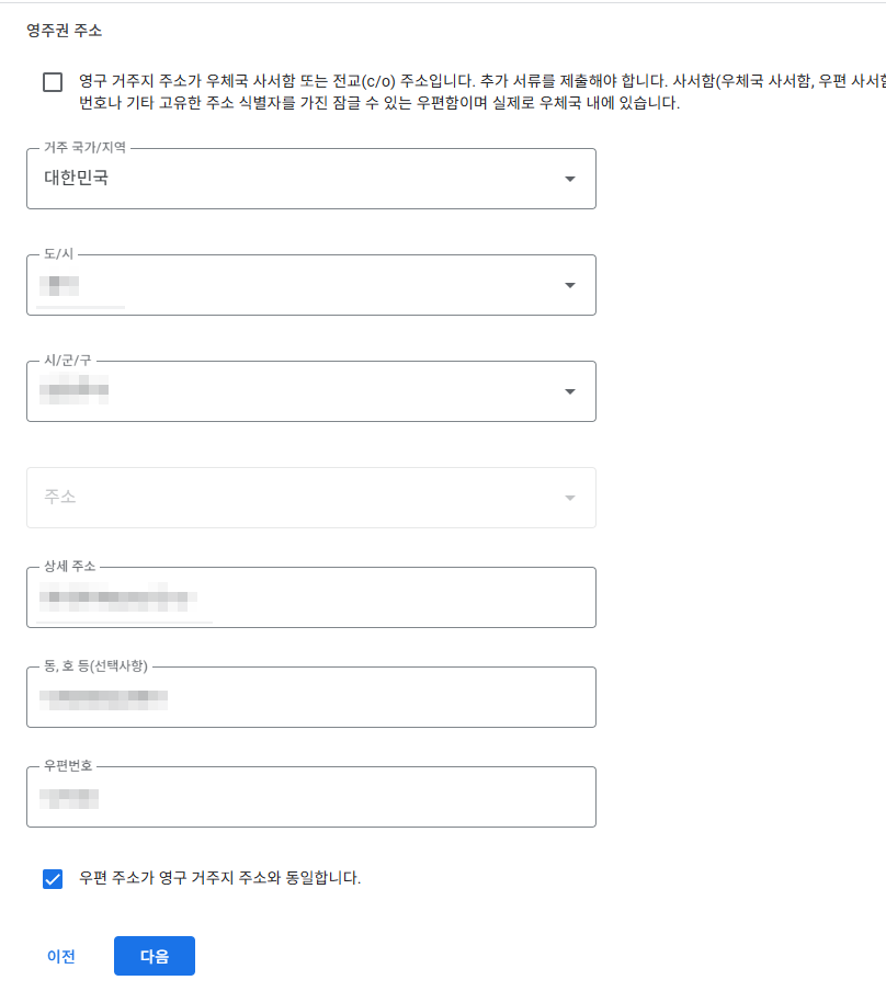 - 우편주소가 영구 거주지 주소와 동일합니다에 체크