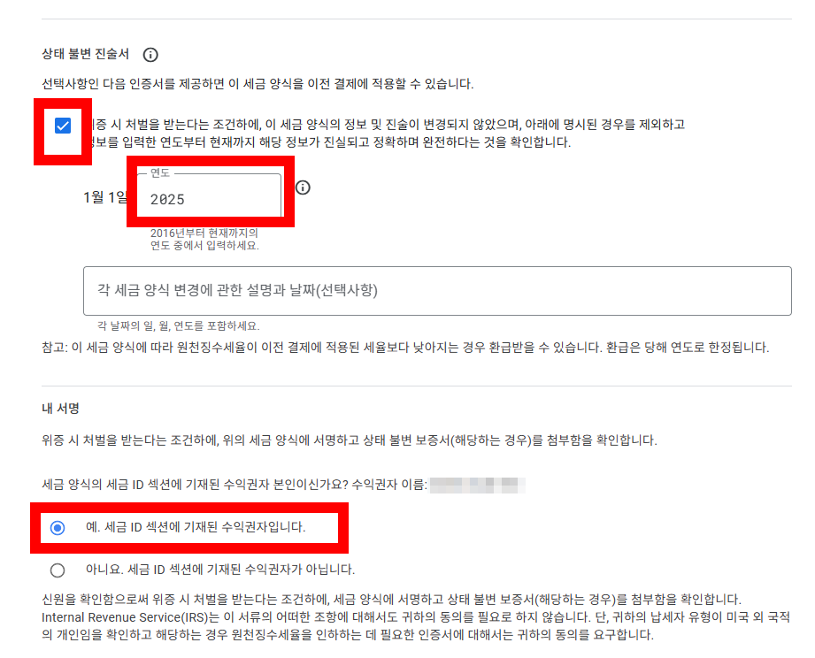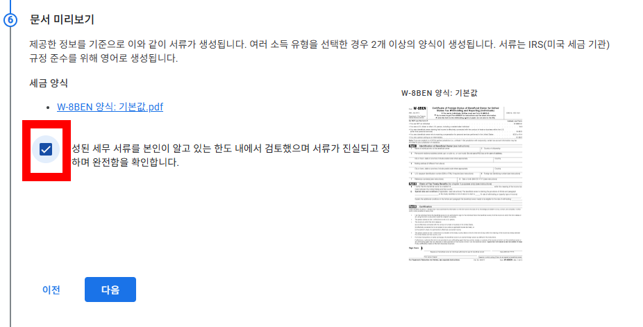 모든 기입이 끝나면 '세금 정보가 승인되었습니다.'라는 멘트가 보이며 W-8BEN양식 상태에 '승인됨'으로 표시가 되면 정상적으로 정보가 입력이 된 것입니다.