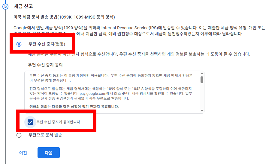 - 우편 수신 중지 선택 (세금 관련된 문서를 이메일로 발송)