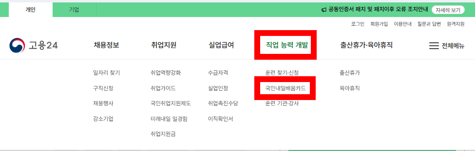 - 상단 메뉴 '직업 능력 개발' → '국민내일배움카드' 클릭