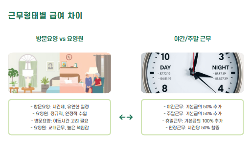 - 방문요양: 시간제 근무이므로 일한 시간만큼 수입이 발생합니다.
